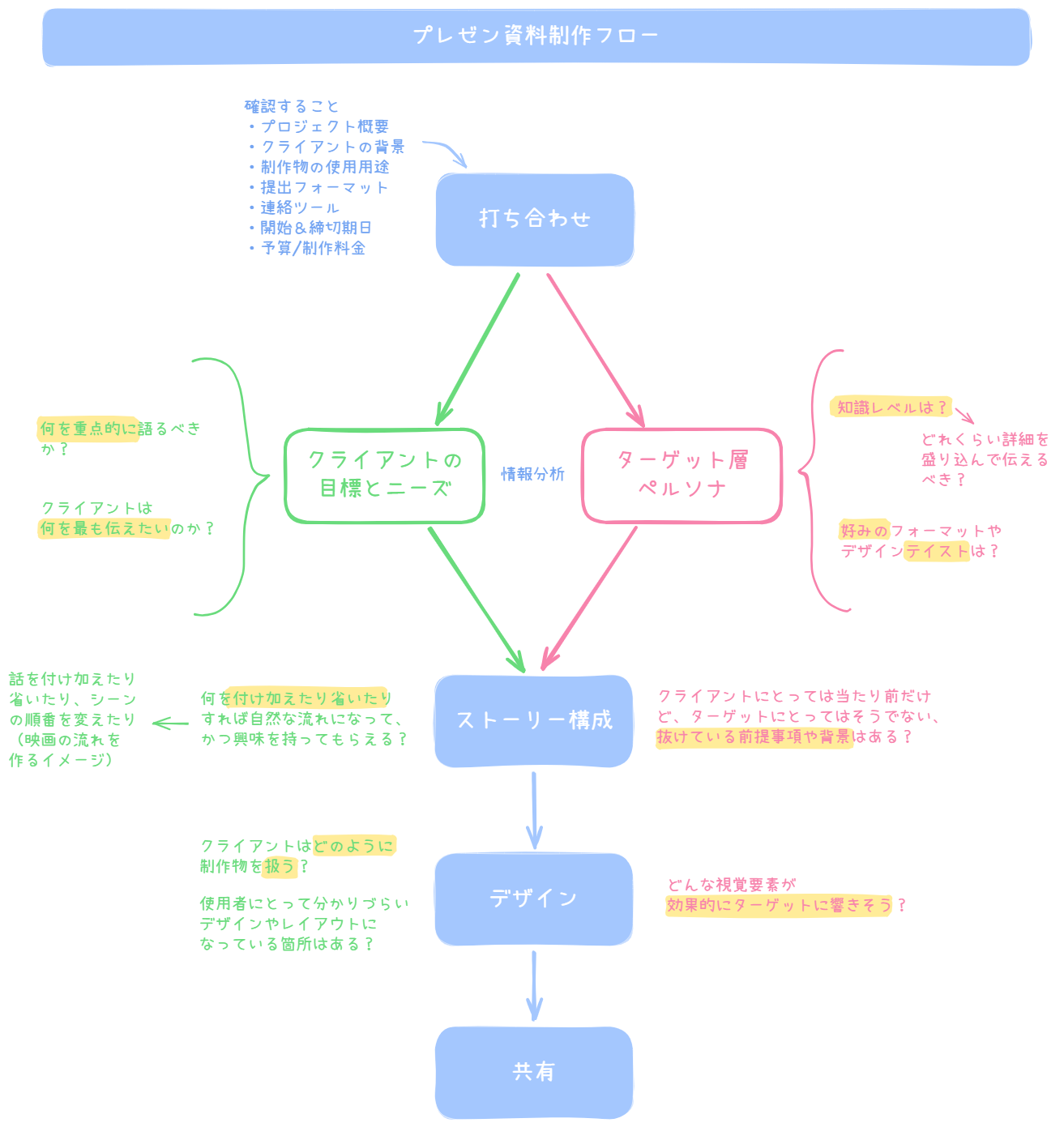 時々、クライアントからプレゼン資料のデザインを手直ししてほしいと依頼されるのですが、根本的に直すならば、見た目のデザインではなく構成や言葉選びの方に手を入れた方が良いと思うことがよくあります。良い映画を作るプロセスと同じ感じで、