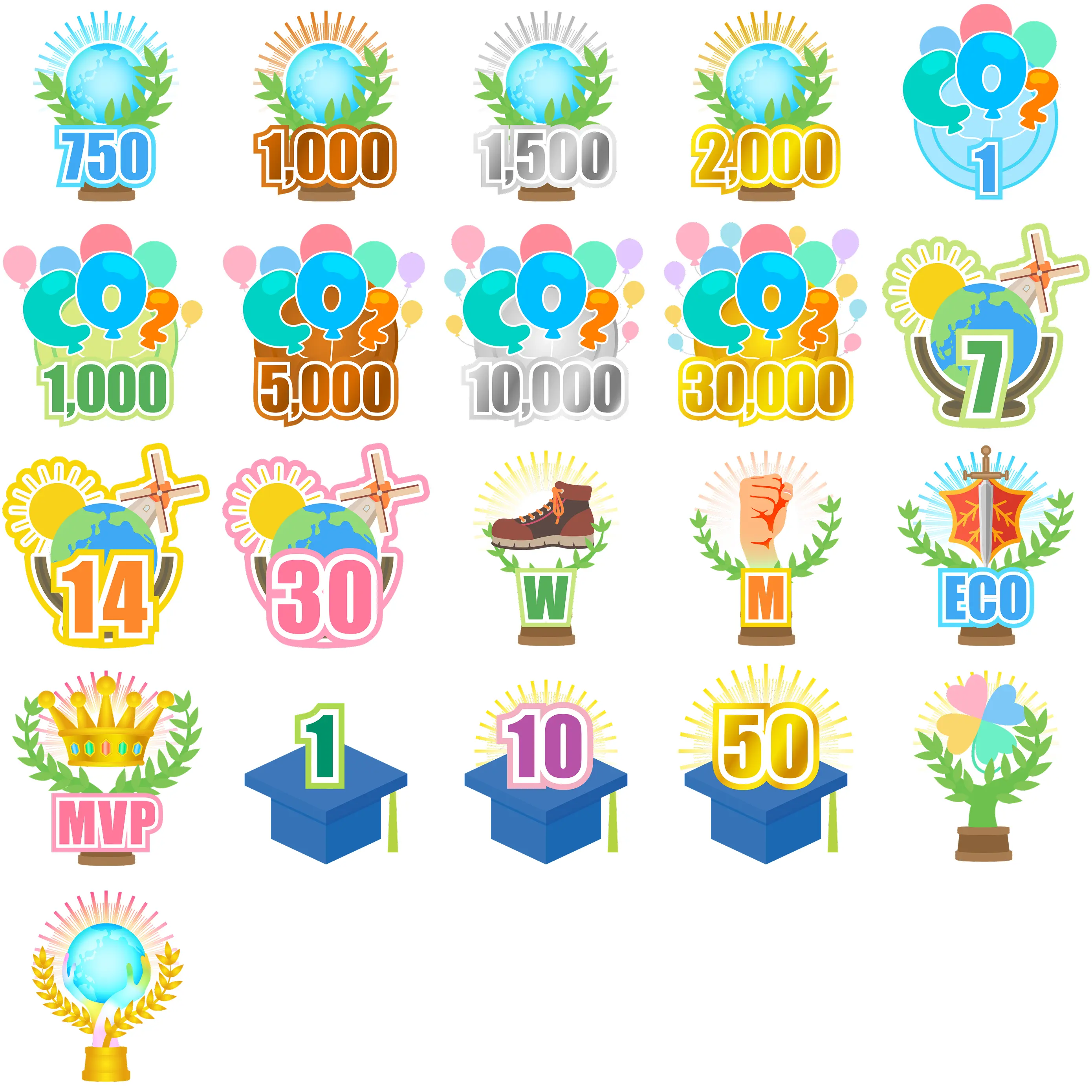 I made a series of reward icons for a mobile app that encourages users to take ecologic actions that reduce CO₂ emissions.